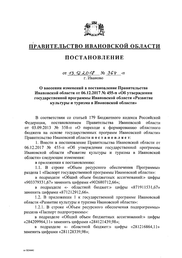 Постановление Правительства Ивановской области от 13.12.2018 N 364-п "О внесении изменений в постановление Правительства Ивановской области от 06.12.2017 N 455-п "Об утверждении государственной программы Ивановской области "Развитие культуры и туризма в Ивановской области"