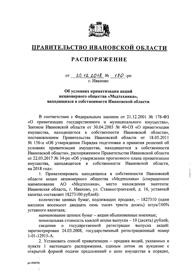 Распоряжение Правительства Ивановской области от 20.12.2018 N 170-рп "Об условиях приватизации акций акционерного общества "Медтехника", находящихся в собственности Ивановской области"