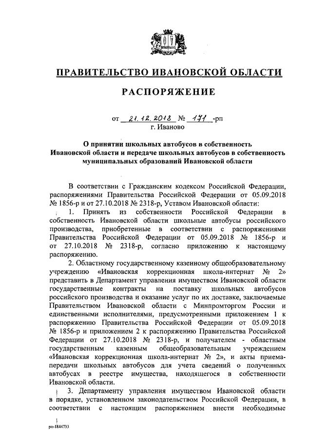 Распоряжение Правительства Ивановской области от 21.12.2018 N 171-рп "О принятии школьных автобусов в собственность Ивановской области и передаче школьных автобусов в собственность муниципальных образований Ивановской области"