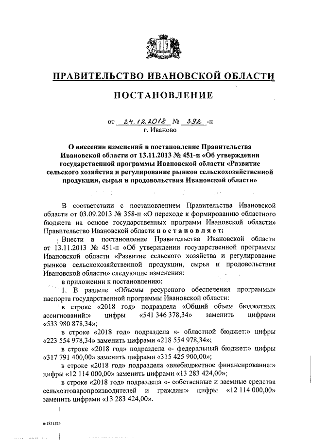 Постановление Правительства Ивановской области от 24.12.2018 N 392-п "О внесении изменений в постановление Правительства Ивановской области от 13.11.2013 N 451-п "Об утверждении государственной программы Ивановской области "Развитие сельского хозяйства и регулирование рынков сельскохозяйственной продукции, сырья и продовольствия Ивановской области"