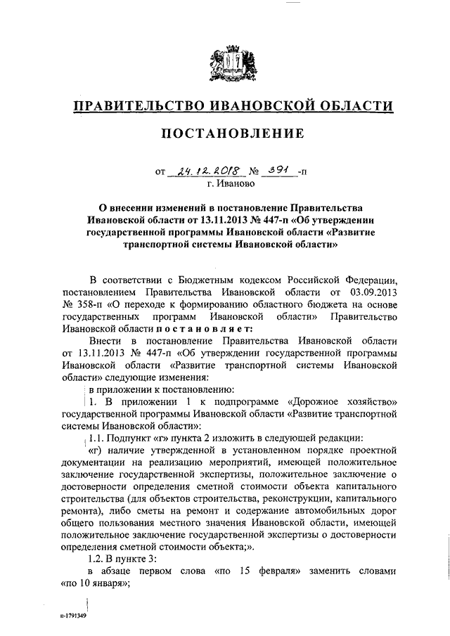 Постановление Правительства Ивановской области от 24.12.2018 N 391-п "О внесении изменений в постановление Правительства Ивановской области от 13.11.2013 N 447-п "Об утверждении государственной программы Ивановской области "Развитие транспортной системы Ивановской области"