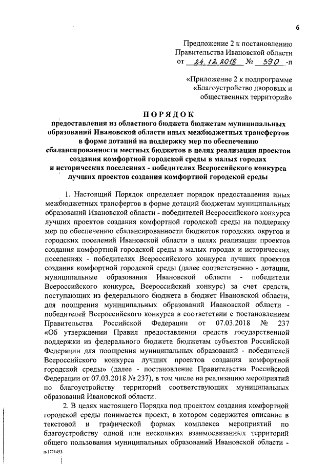 Постановление Правительства Ивановской области от 24.12.2018 N 390-п "О внесении изменений в постановление Правительства Ивановской области от 01.09.2017 N 337-п "Об утверждении государственной программы Ивановской области "Формирование современной городской среды" на 2018 - 2022 годы" (вместе с "Порядком предоставления из областного бюджета бюджетам муниципальных образований Ивановской области иных межбюджетных трансфертов в форме дотаций на поддержку мер по обеспечению сбалансированности местных бюджетов в целях реализации проектов создания комфортной городской среды в малых городах и исторических поселениях - победителях Всероссийского конкурса лучших проектов создания комфортной городской среды")