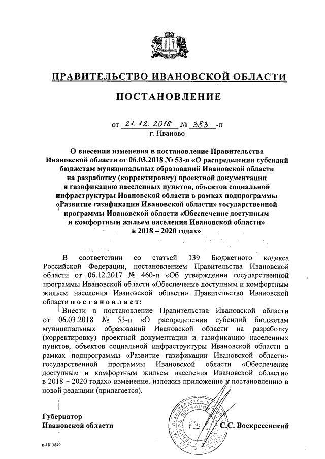Постановление Правительства Ивановской области от 21.12.2018 N 383-п "О внесении изменения в постановление Правительства Ивановской области от 06.03.2018 N 53-п "О распределении субсидий бюджетам муниципальных образований Ивановской области на разработку (корректировку) проектной документации и газификацию населенных пунктов, объектов социальной инфраструктуры Ивановской области в рамках подпрограммы "Развитие газификации Ивановской области" государственной программы Ивановской области "Обеспечение доступным и комфортным жильем населения Ивановской области" в 2018 - 2020 годах"