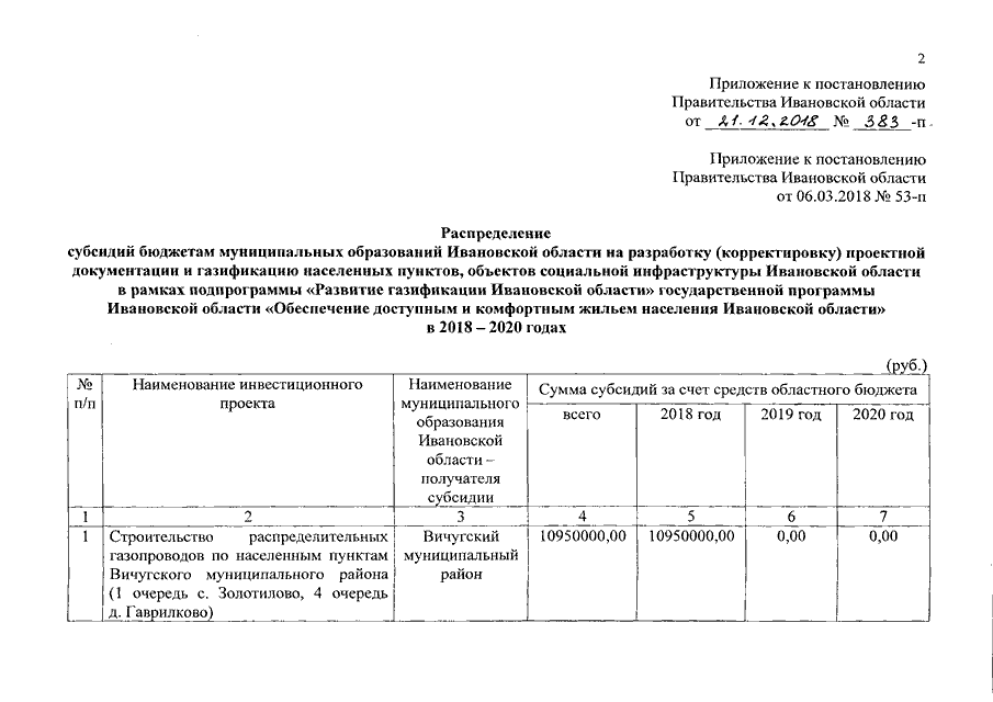 Постановление Правительства Ивановской области от 21.12.2018 N 383-п "О внесении изменения в постановление Правительства Ивановской области от 06.03.2018 N 53-п "О распределении субсидий бюджетам муниципальных образований Ивановской области на разработку (корректировку) проектной документации и газификацию населенных пунктов, объектов социальной инфраструктуры Ивановской области в рамках подпрограммы "Развитие газификации Ивановской области" государственной программы Ивановской области "Обеспечение доступным и комфортным жильем населения Ивановской области" в 2018 - 2020 годах"