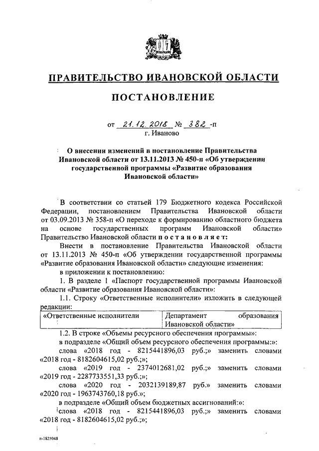 Постановление Правительства Ивановской области от 21.12.2018 N 382-п "О внесении изменений в постановление Правительства Ивановской области от 13.11.2013 N 450-п "Об утверждении государственной программы "Развитие образования Ивановской области"
