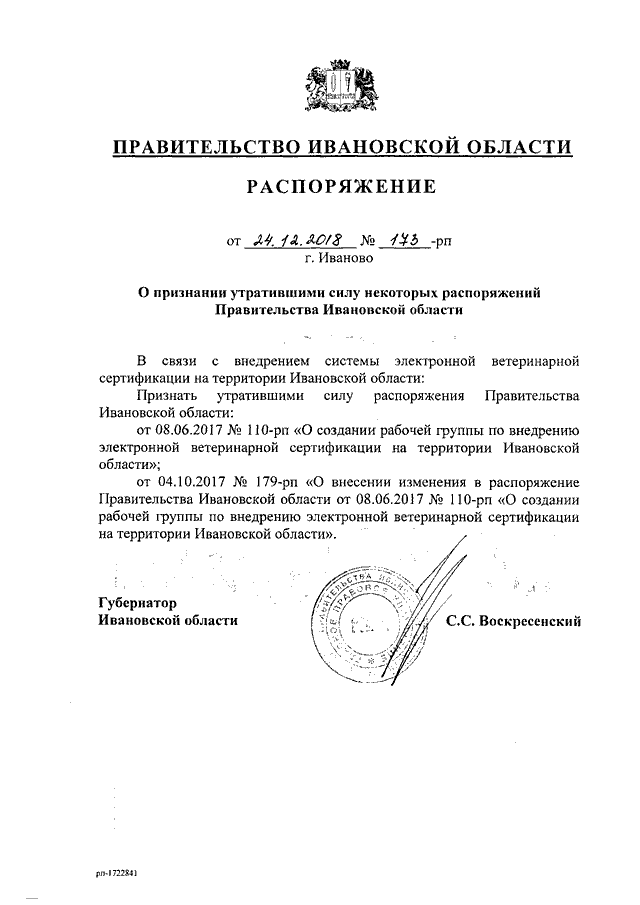 Распоряжение Правительства Ивановской области от 24.12.2018 N 173-рп "О признании утратившими силу некоторых распоряжений Правительства Ивановской области"