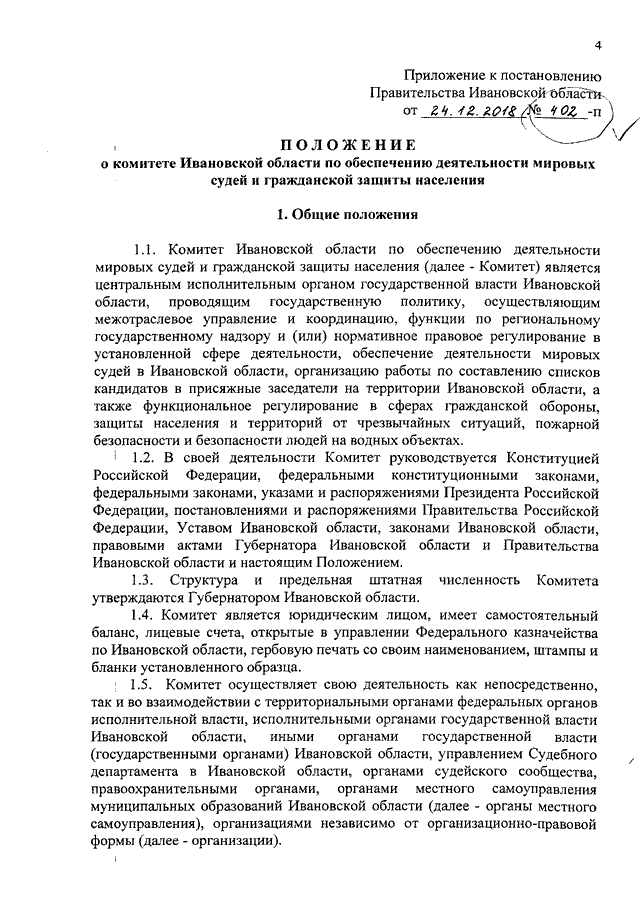 Постановление Правительства Ивановской области от 24.12.2018 N 402-п "Об утверждении Положения о комитете Ивановской области по обеспечению деятельности мировых судей и гражданской защиты населения"