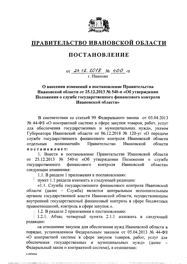 Постановление Правительства Ивановской области от 24.12.2018 N 400-п "О внесении изменений в постановление Правительства Ивановской области от 25.12.2013 N 540-п "Об утверждении Положения о службе государственного финансового контроля Ивановской области"