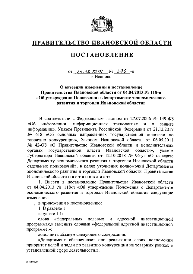 Постановление Правительства Ивановской области от 24.12.2018 N 399-п "О внесении изменений в постановление Правительства Ивановской области от 04.04.2013 N 118-п "Об утверждении Положения о Департаменте экономического развития и торговли Ивановской области"