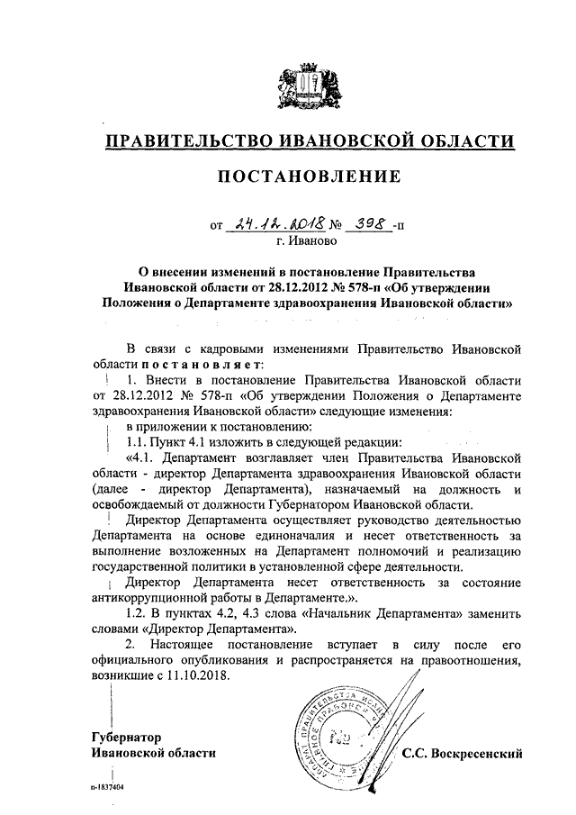 Постановление Правительства Ивановской области от 24.12.2018 N 398-п "О внесении изменений в постановление Правительства Ивановской области от 28.12.2012 N 578-п "Об утверждении Положения о Департаменте здравоохранения Ивановской области"