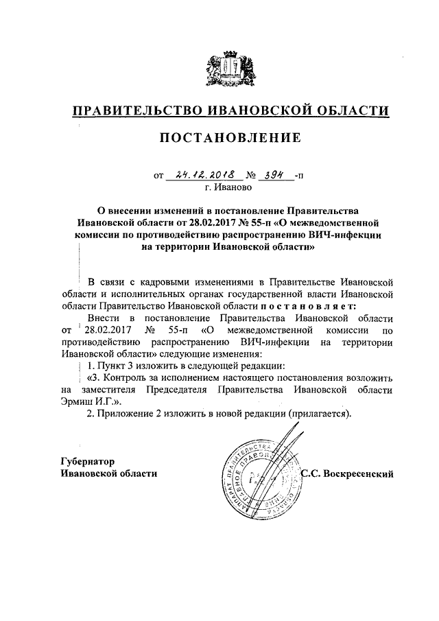 Постановление Правительства Ивановской области от 24.12.2018 N 394-п "О внесении изменений в постановление Правительства Ивановской области от 28.02.2017 N 55-п "О межведомственной комиссии по противодействию распространению ВИЧ-инфекции на территории Ивановской области"