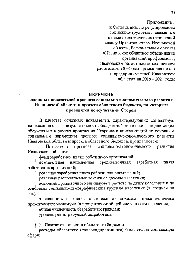 "Соглашение по регулированию социально-трудовых и связанных с ними экономических отношений между Правительством Ивановской области, Региональным союзом "Ивановское областное объединение организаций профсоюзов", Ивановским областным объединением работодателей "Союз промышленников и предпринимателей Ивановской области" на 2019 - 2021 годы" (Заключено 25.12.2018 N 42-с) (вместе с "Перечнем основных показателей прогноза социально-экономического развития Ивановской области и проекта областного бюджета, по которым проводятся консультации Сторон", "Рекомендациями областной трехсторонней комиссии по регулированию социально-трудовых отношений представителям работников и работодателей по включению положений в коллективный договор организации, отраслевые (межотраслевые), территориальные и иные соглашения по вопросам регулирования социально-трудовых и иных непосредственно связанных с ними отношений")