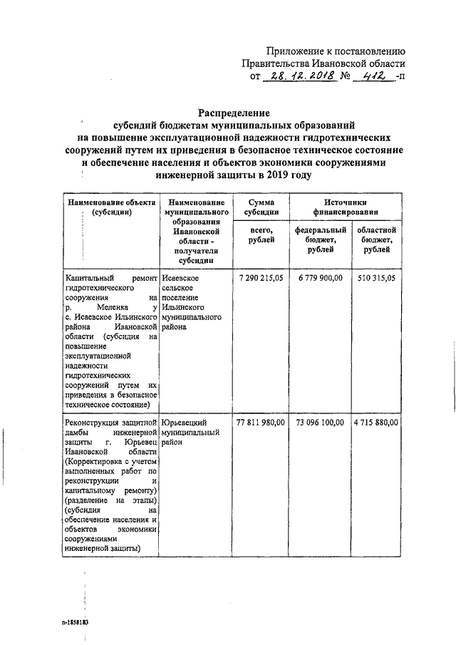 Постановление Правительства Ивановской области от 28.12.2018 N 412-п "О распределении субсидий бюджетам муниципальных образований на повышение эксплуатационной надежности гидротехнических сооружений путем их приведения в безопасное техническое состояние и обеспечение населения и объектов экономики сооружениями инженерной защиты в 2019 году"