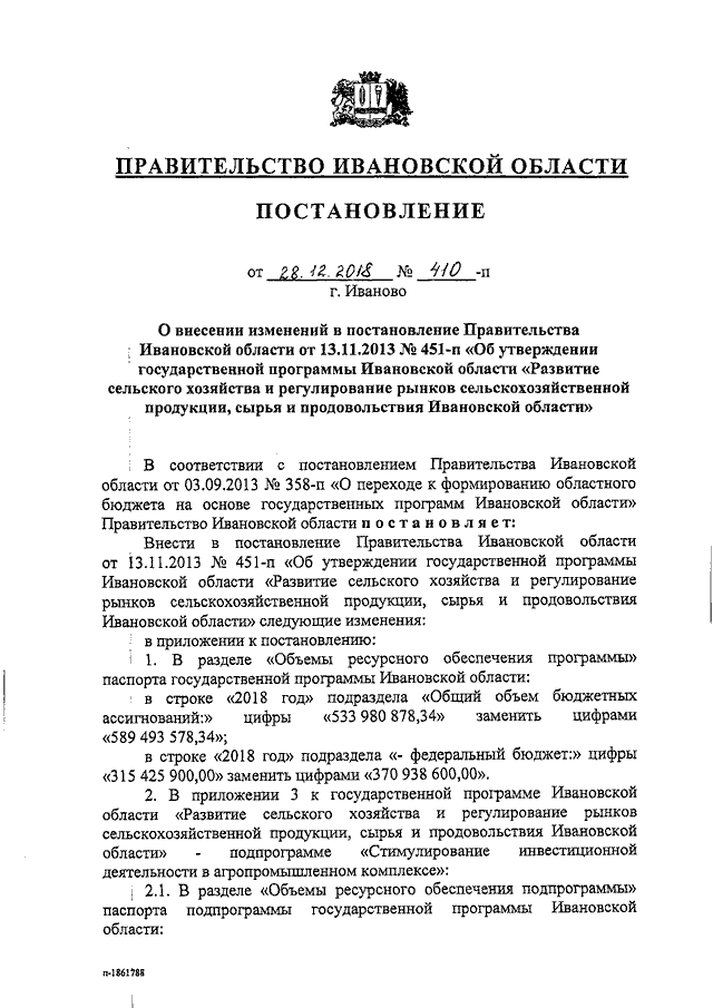 Постановление Правительства Ивановской области от 28.12.2018 N 410-п "О внесении изменений в постановление Правительства Ивановской области от 13.11.2013 N 451-п "Об утверждении государственной программы Ивановской области "Развитие сельского хозяйства и регулирование рынков сельскохозяйственной продукции, сырья и продовольствия Ивановской области"