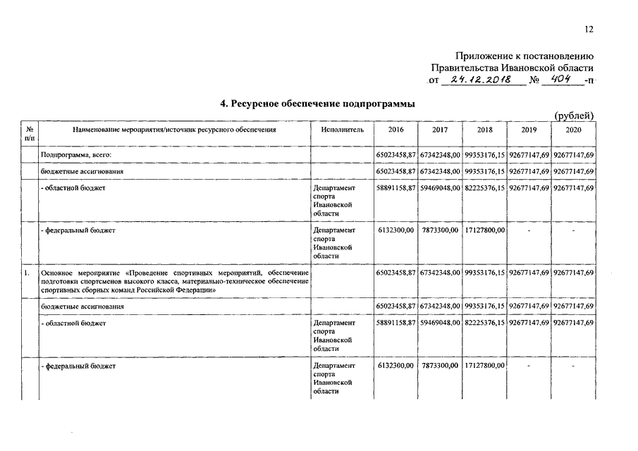 Постановление Правительства Ивановской области от 24.12.2018 N 404-п "О внесении изменений в постановление Правительства Ивановской области от 18.02.2016 N 43-п "Об утверждении государственной программы Ивановской области "Развитие физической культуры и спорта в Ивановской области"