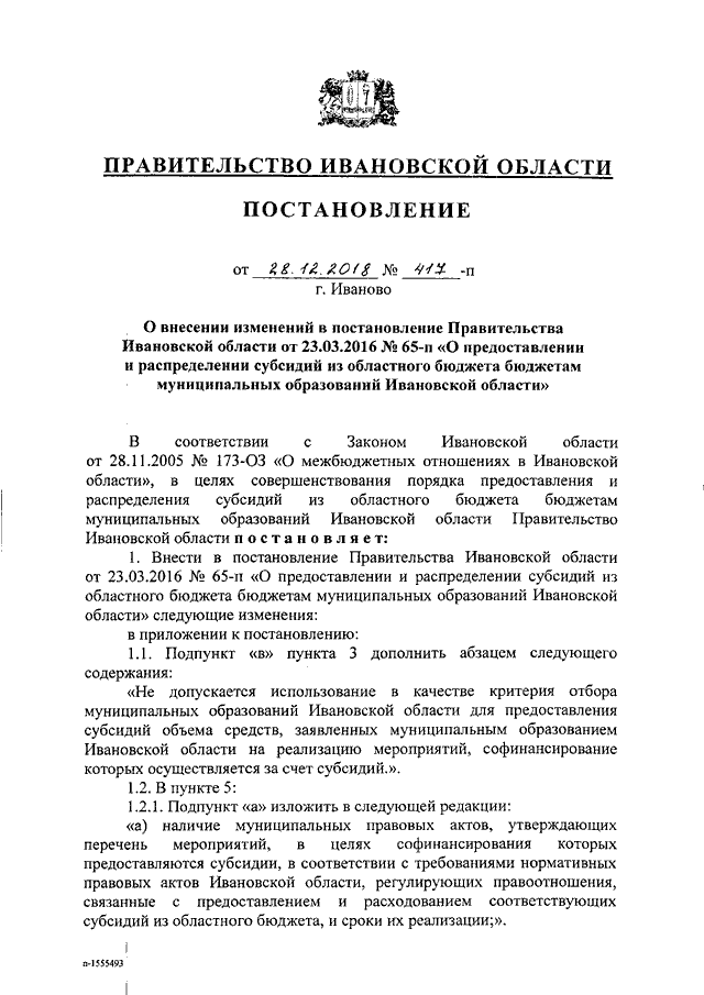 Постановление Правительства Ивановской области от 28.12.2018 N 417-п "О внесении изменений в постановление Правительства Ивановской области от 23.03.2016 N 65-п "О предоставлении и распределении субсидий из областного бюджета бюджетам муниципальных образований Ивановской области"