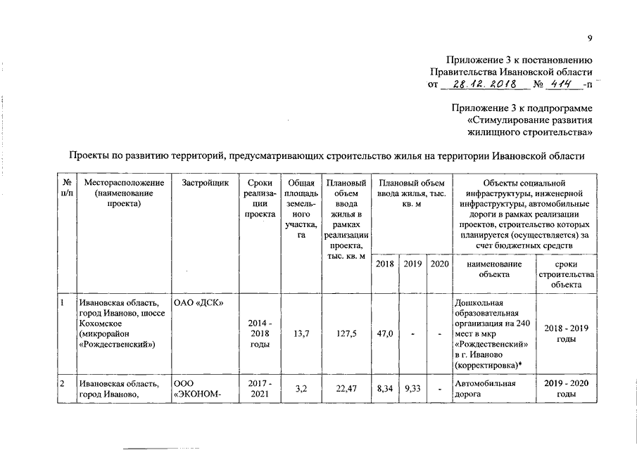 Постановление Правительства Ивановской области от 28.12.2018 N 414-п "О внесении изменений в постановление Правительства Ивановской области от 06.12.2017 N 460-п "Об утверждении государственной программы Ивановской области "Обеспечение доступным и комфортным жильем населения Ивановской области" (вместе с "Проектами по развитию территорий, предусматривающих строительство жилья на территории Ивановской области")