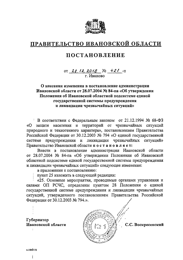 Постановление Правительства Ивановской области от 28.12.2018 N 421-п "О внесении изменения в постановление администрации Ивановской области от 28.07.2004 N 84-па "Об утверждении Положения об Ивановской областной подсистеме единой государственной системы предупреждения и ликвидации чрезвычайных ситуаций"