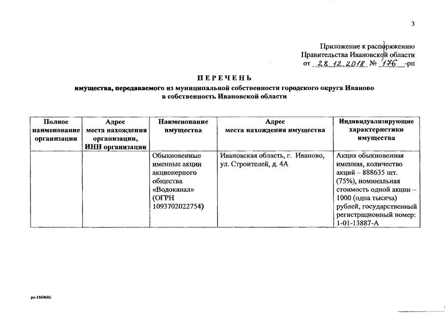 Распоряжение Правительства Ивановской области от 28.12.2018 N 176-рп "О принятии движимого имущества из муниципальной собственности городского округа Иваново в собственность Ивановской области"
