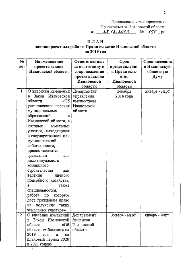 Распоряжение Правительства Ивановской области от 28.12.2018 N 180-рп "О плане законопроектных работ в Правительстве Ивановской области на 2019 год"