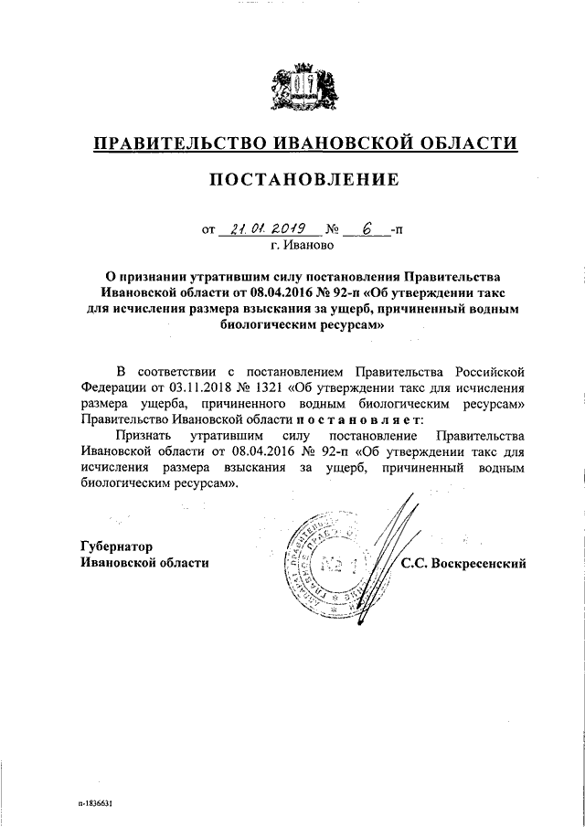 Постановление Правительства Ивановской области от 21.01.2019 N 6-п "О признании утратившим силу постановления Правительства Ивановской области от 08.04.2016 N 92-п "Об утверждении такс для исчисления размера взыскания за ущерб, причиненный водным биологическим ресурсам"