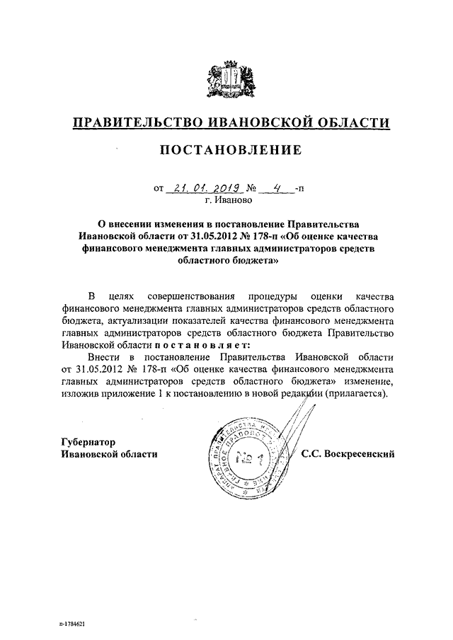 Постановление Правительства Ивановской области от 21.01.2019 N 4-п "О внесении изменения в постановление Правительства Ивановской области от 31.05.2012 N 178-п "Об оценке качества финансового менеджмента главных администраторов средств областного бюджета" (вместе с "Методикой оценки качества финансового менеджмента главных администраторов средств областного бюджета")