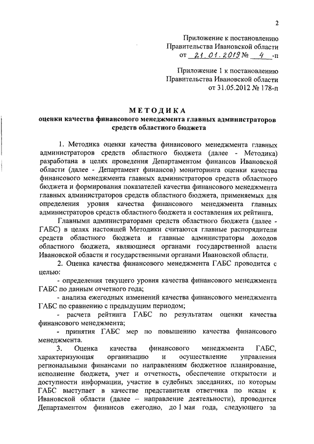 Постановление Правительства Ивановской области от 21.01.2019 N 4-п "О внесении изменения в постановление Правительства Ивановской области от 31.05.2012 N 178-п "Об оценке качества финансового менеджмента главных администраторов средств областного бюджета" (вместе с "Методикой оценки качества финансового менеджмента главных администраторов средств областного бюджета")