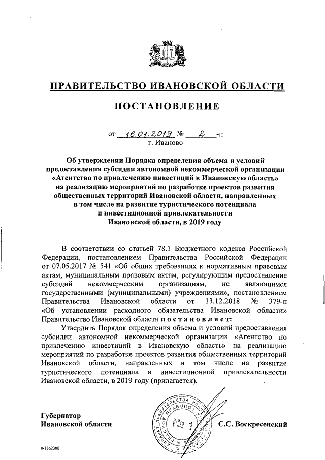 Постановление Правительства Ивановской области от 16.01.2019 N 2-п "Об утверждении Порядка определения объема и условий предоставления субсидии автономной некоммерческой организации "Агентство по привлечению инвестиций в Ивановскую область" на реализацию мероприятий по разработке проектов развития общественных территорий Ивановской области, направленных в том числе на развитие туристического потенциала и инвестиционной привлекательности Ивановской области, в 2019 году"