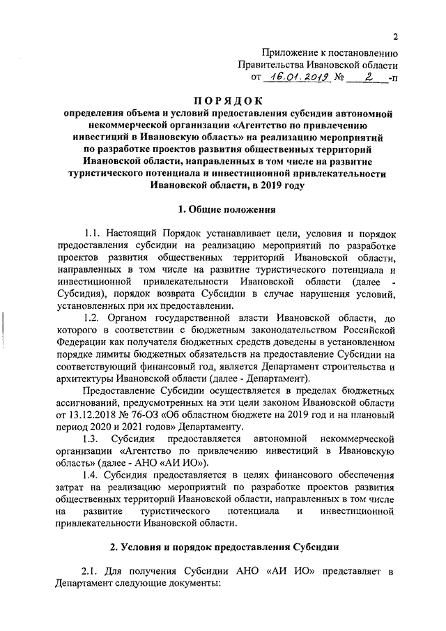 Постановление Правительства Ивановской области от 16.01.2019 N 2-п "Об утверждении Порядка определения объема и условий предоставления субсидии автономной некоммерческой организации "Агентство по привлечению инвестиций в Ивановскую область" на реализацию мероприятий по разработке проектов развития общественных территорий Ивановской области, направленных в том числе на развитие туристического потенциала и инвестиционной привлекательности Ивановской области, в 2019 году"