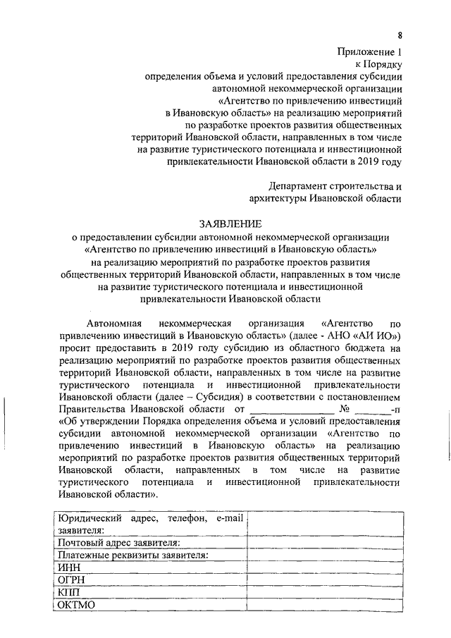 Постановление Правительства Ивановской области от 16.01.2019 N 2-п "Об утверждении Порядка определения объема и условий предоставления субсидии автономной некоммерческой организации "Агентство по привлечению инвестиций в Ивановскую область" на реализацию мероприятий по разработке проектов развития общественных территорий Ивановской области, направленных в том числе на развитие туристического потенциала и инвестиционной привлекательности Ивановской области, в 2019 году"