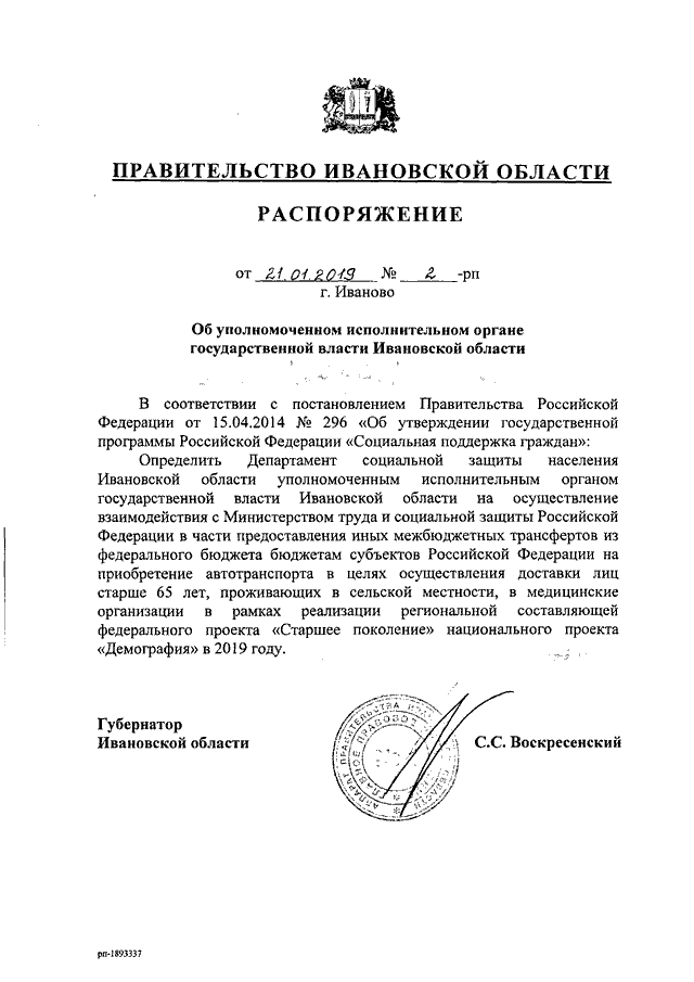 Распоряжение Правительства Ивановской области от 21.01.2019 N 2-рп "Об уполномоченном исполнительном органе государственной власти Ивановской области"
