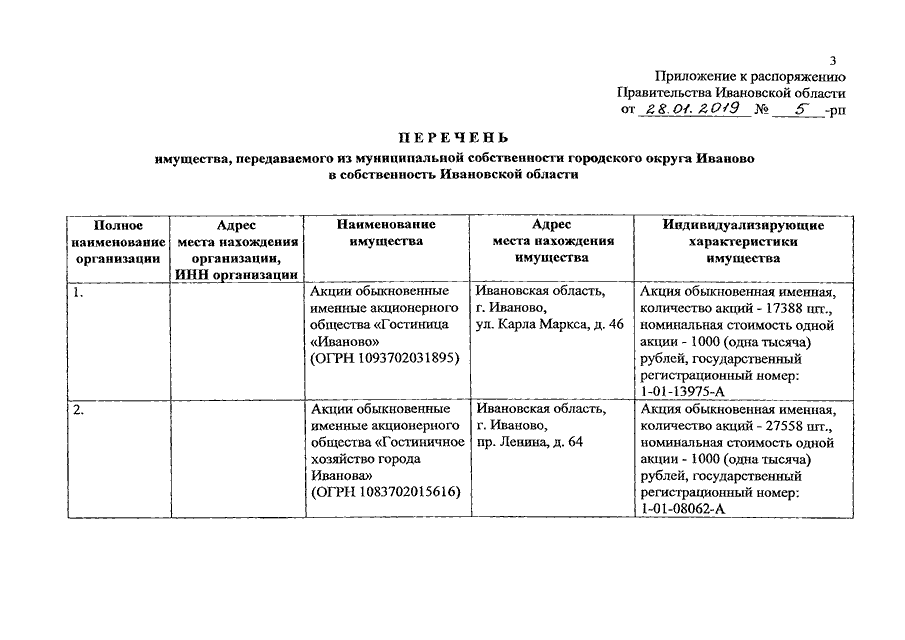 Распоряжение Правительства Ивановской области от 28.01.2019 N 5-рп "О принятии движимого имущества из муниципальной собственности городского округа Иваново в собственность Ивановской области"
