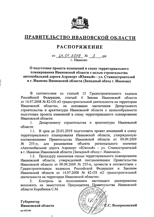 Распоряжение Правительства Ивановской области от 24.01.2019 N 3-рп "О подготовке проекта изменений в схему территориального планирования Ивановской области с целью строительства автомобильной дороги Аэропорт "Южный" - ул. Станкостроителей в г. Иваново Ивановской области (Западный обход г. Иваново)"
