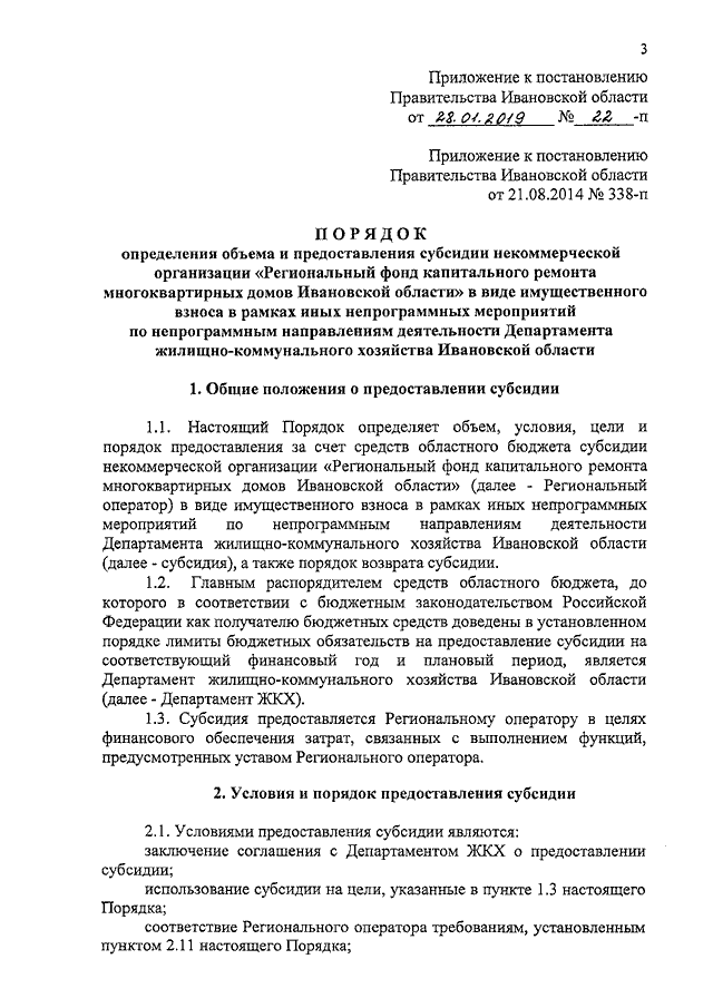 Постановление Правительства Ивановской области от 28.01.2019 N 22-п "О внесении изменения в постановление Правительства Ивановской области от 21.08.2014 N 338-п "Об утверждении Порядка определения объема и предоставления субсидии некоммерческой организации "Региональный фонд капитального ремонта многоквартирных домов Ивановской области" в виде имущественного взноса в рамках иных непрограммных мероприятий по непрограммным направлениям деятельности Департамента жилищно-коммунального хозяйства Ивановской области"