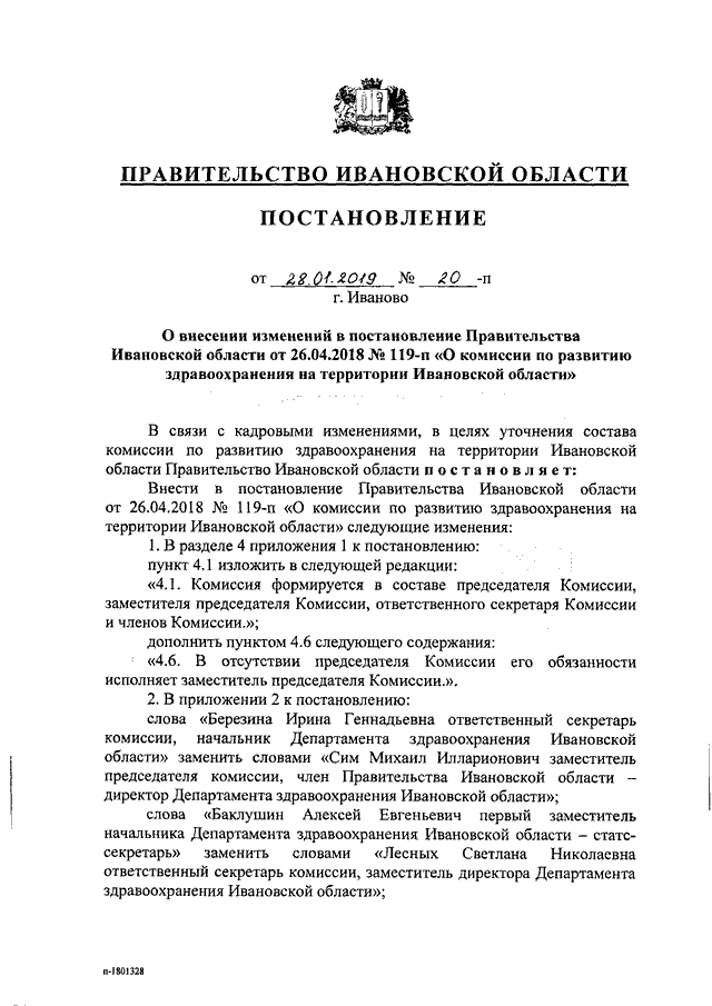 Постановление Правительства Ивановской области от 28.01.2019 N 20-п "О внесении изменений в постановление Правительства Ивановской области от 26.04.2018 N 119-п "О комиссии по развитию здравоохранения на территории Ивановской области"