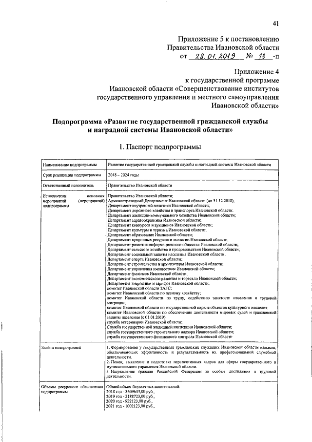 Постановление Правительства Ивановской области от 28.01.2019 N 13-п "О внесении изменений в постановление Правительства Ивановской области от 13.11.2013 N 454-п "Об утверждении государственной программы Ивановской области "Совершенствование институтов государственного управления и местного самоуправления Ивановской области" (вместе с "Подпрограммой "Развитие государственной гражданской службы и наградной системы Ивановской области")