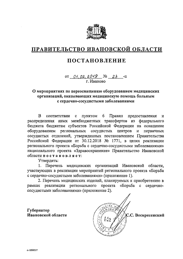 Постановление Правительства Ивановской области от 01.02.2019 N 23-п "О мероприятиях по переоснащению оборудованием медицинских организаций, оказывающих медицинскую помощь больным с сердечно-сосудистыми заболеваниями" (вместе с "Перечнем медицинских организаций Ивановской области, участвующих в реализации мероприятий регионального проекта "Борьба с сердечно-сосудистыми заболеваниями", "Перечнем медицинских изделий, планируемых к приобретению в рамках реализации мероприятий регионального проекта "Борьба с сердечно-сосудистыми заболеваниями")