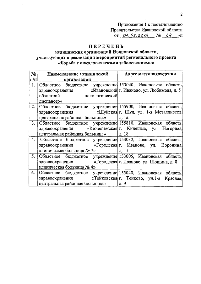 Постановление Правительства Ивановской области от 01.02.2019 N 24-п "О мероприятиях по переоснащению оборудованием медицинских организаций, оказывающих медицинскую помощь больным с онкологическими заболеваниями" (вместе с "Перечнем медицинских организаций Ивановской области, участвующих в реализации мероприятий регионального проекта "Борьба с онкологическими заболеваниями", "Перечнем медицинских изделий, планируемых к приобретению в рамках реализации регионального проекта "Борьба с онкологическими заболеваниями")