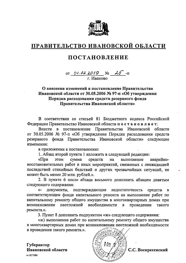 Постановление Правительства Ивановской области от 01.02.2019 N 25-п "О внесении изменений в постановление Правительства Ивановской области от 30.05.2006 N 97-п "Об утверждении Порядка расходования средств резервного фонда Правительства Ивановской области"