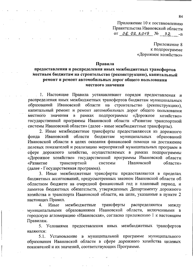 Постановление Правительства Ивановской области от 06.02.2019 N 32-п "О внесении изменений в постановление Правительства Ивановской области от 13.11.2013 N 447-п "Об утверждении государственной программы Ивановской области "Развитие транспортной системы Ивановской области" (вместе с "Паспортом подпрограммы", "Правилами предоставления и распределения иных межбюджетных трансфертов местным бюджетам на строительство (реконструкцию), капитальный ремонт и ремонт автомобильных дорог общего пользования местного значения", "Подпрограммой "Субсидирование транспортного обслуживания населения Ивановской области")