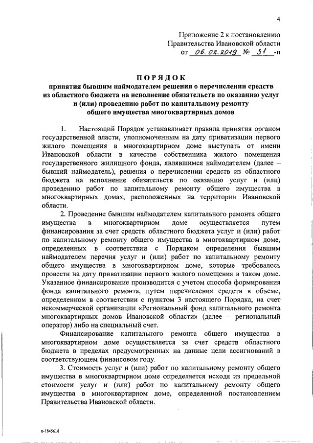 Постановление Правительства Ивановской области от 06.02.2019 N 31-п "Об утверждении порядков, регулирующих отношения в сфере обеспечения проведения капитального ремонта общего имущества в многоквартирных домах, в которых требовалось проведение капитального ремонта на дату приватизации первого жилого помещения" (вместе с "Порядком определения бывшим наймодателем перечня услуг и (или) работ по капитальному ремонту общего имущества в многоквартирном доме, которые требовалось провести на дату приватизации первого жилого помещения в таком доме", "Порядком принятия бывшим наймодателем решения о перечислении средств из областного бюджета на исполнение обязательств по оказанию услуг и (или) проведению работ по капитальному ремонту общего имущества многоквартирных домов", "Порядком информирования собственников помещений в многоквартирном доме об исполнении бывшим наймодателем обязанности по проведению капитального ремонта, а также о положениях части 4 статьи 190.1 Жилищного кодекса Российской Федерации")