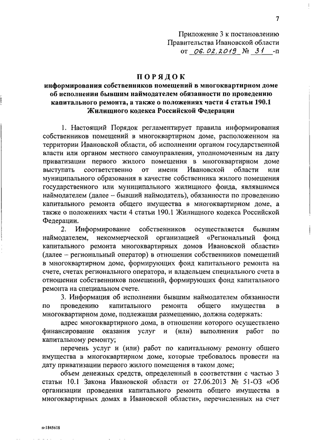 Постановление Правительства Ивановской области от 06.02.2019 N 31-п "Об утверждении порядков, регулирующих отношения в сфере обеспечения проведения капитального ремонта общего имущества в многоквартирных домах, в которых требовалось проведение капитального ремонта на дату приватизации первого жилого помещения" (вместе с "Порядком определения бывшим наймодателем перечня услуг и (или) работ по капитальному ремонту общего имущества в многоквартирном доме, которые требовалось провести на дату приватизации первого жилого помещения в таком доме", "Порядком принятия бывшим наймодателем решения о перечислении средств из областного бюджета на исполнение обязательств по оказанию услуг и (или) проведению работ по капитальному ремонту общего имущества многоквартирных домов", "Порядком информирования собственников помещений в многоквартирном доме об исполнении бывшим наймодателем обязанности по проведению капитального ремонта, а также о положениях части 4 статьи 190.1 Жилищного кодекса Российской Федерации")