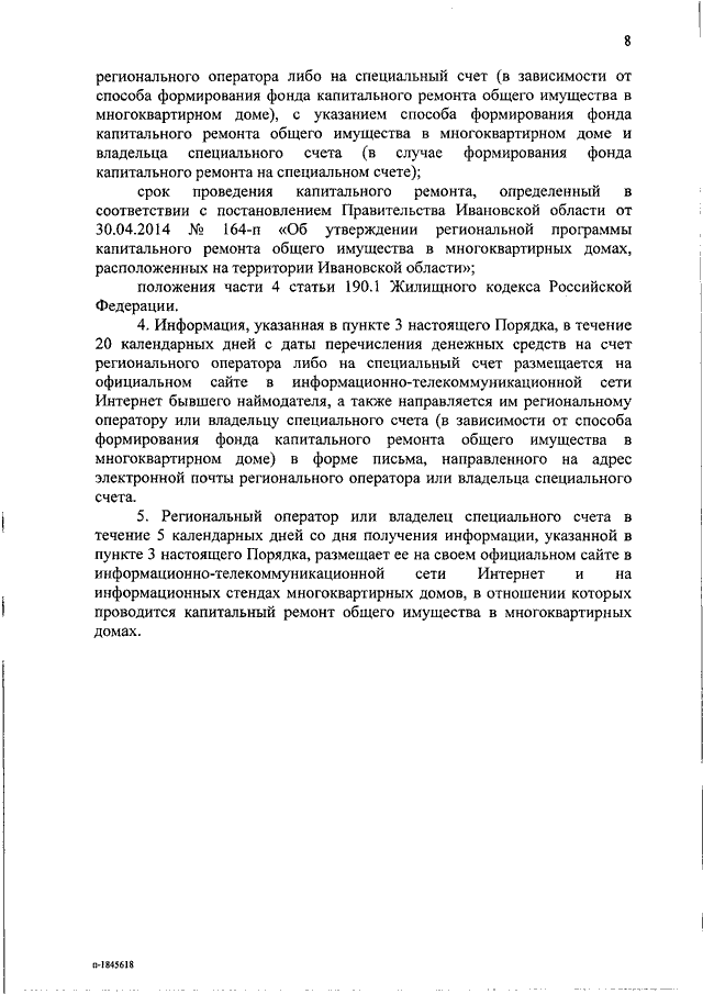 Постановление Правительства Ивановской области от 06.02.2019 N 31-п "Об утверждении порядков, регулирующих отношения в сфере обеспечения проведения капитального ремонта общего имущества в многоквартирных домах, в которых требовалось проведение капитального ремонта на дату приватизации первого жилого помещения" (вместе с "Порядком определения бывшим наймодателем перечня услуг и (или) работ по капитальному ремонту общего имущества в многоквартирном доме, которые требовалось провести на дату приватизации первого жилого помещения в таком доме", "Порядком принятия бывшим наймодателем решения о перечислении средств из областного бюджета на исполнение обязательств по оказанию услуг и (или) проведению работ по капитальному ремонту общего имущества многоквартирных домов", "Порядком информирования собственников помещений в многоквартирном доме об исполнении бывшим наймодателем обязанности по проведению капитального ремонта, а также о положениях части 4 статьи 190.1 Жилищного кодекса Российской Федерации")