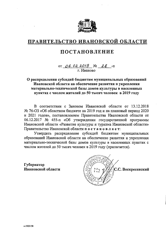 Постановление Правительства Ивановской области от 06.02.2019 N 28-п "О распределении субсидий бюджетам муниципальных образований Ивановской области на обеспечение развития и укрепления материально-технической базы домов культуры в населенных пунктах с числом жителей до 50 тысяч человек в 2019 году"