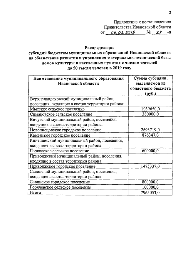 Постановление Правительства Ивановской области от 06.02.2019 N 28-п "О распределении субсидий бюджетам муниципальных образований Ивановской области на обеспечение развития и укрепления материально-технической базы домов культуры в населенных пунктах с числом жителей до 50 тысяч человек в 2019 году"