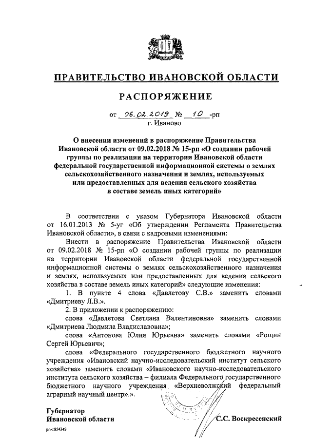 Распоряжение Правительства Ивановской области от 06.02.2019 N 10-рп "О внесении изменений в распоряжение Правительства Ивановской области от 09.02.2018 N 15-рп "О создании рабочей группы по реализации на территории Ивановской области федеральной государственной информационной системы о землях сельскохозяйственного назначения и землях, используемых или предоставленных для ведения сельского хозяйства в составе земель иных категорий"