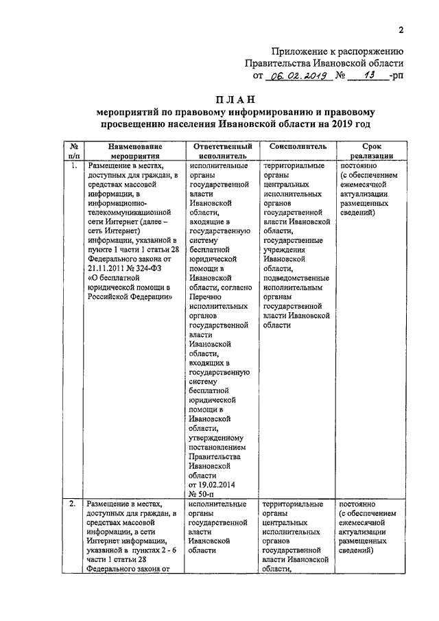 Распоряжение Правительства Ивановской области от 06.02.2019 N 13-рп "О Плане мероприятий по правовому информированию и правовому просвещению населения Ивановской области на 2019 год"