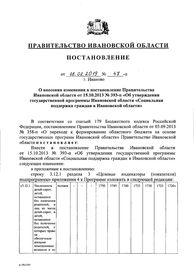 Постановление Правительства Ивановской области от 08.02.2019 N 47-п "О внесении изменения в постановление Правительства Ивановской области от 15.10.2013 N 393-п "Об утверждении государственной программы Ивановской области "Социальная поддержка граждан в Ивановской области"