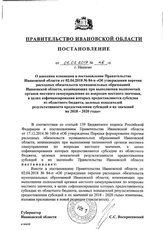 Постановление Правительства Ивановской области от 06.02.2019 N 46-п "О внесении изменения в постановление Правительства Ивановской области от 02.04.2018 N 84-п "Об утверждении перечня расходных обязательств муниципальных образований Ивановской области, возникающих при выполнении полномочий органов местного самоуправления по вопросам местного значения, в целях софинансирования которых предоставляются субсидии из областного бюджета, целевых показателей результативности предоставления субсидий и их значений на 2018 - 2020 годы"