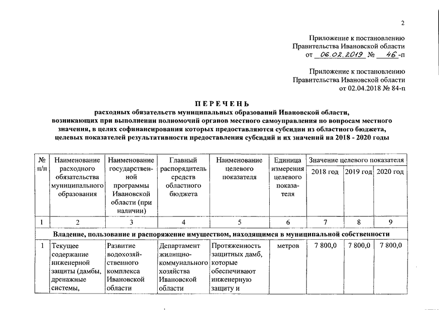 Постановление Правительства Ивановской области от 06.02.2019 N 46-п "О внесении изменения в постановление Правительства Ивановской области от 02.04.2018 N 84-п "Об утверждении перечня расходных обязательств муниципальных образований Ивановской области, возникающих при выполнении полномочий органов местного самоуправления по вопросам местного значения, в целях софинансирования которых предоставляются субсидии из областного бюджета, целевых показателей результативности предоставления субсидий и их значений на 2018 - 2020 годы"